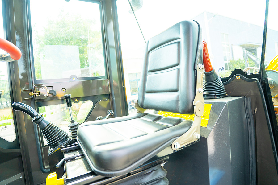 The suspended shock-absorbing 360-degree rotating seat with a seat belt improves the comfort and safety of the driver.